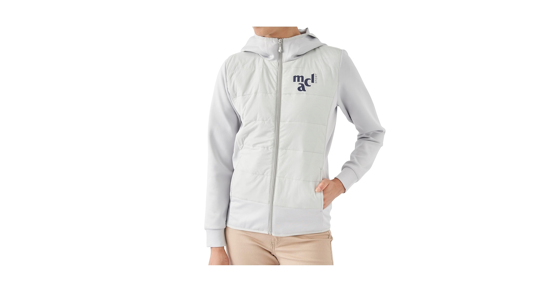 裏起毛のハイストレッチ天竺を使用。ロゴテープがアクセントになった前立て、袖口はスリットを入れたカフスデザインが、折り返して配色を見せて着用できる2way仕様。ラインを美しく見せる胸の切替とフィット感のあるシルエット。