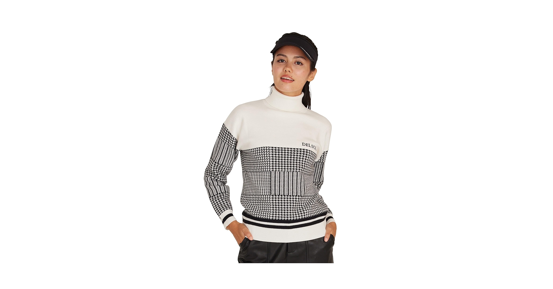 [Delsol] 7839 グレンチェック柄タートルネックニット ホワイト 秋冬 ゴルフウェア デルソル レディース ゴルフ トップス 長袖 タートルネック ニット セーター グレンチェック レーヨン混 大きいサイズ M L LL 3L 4L